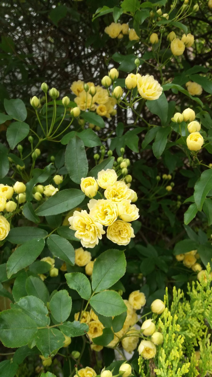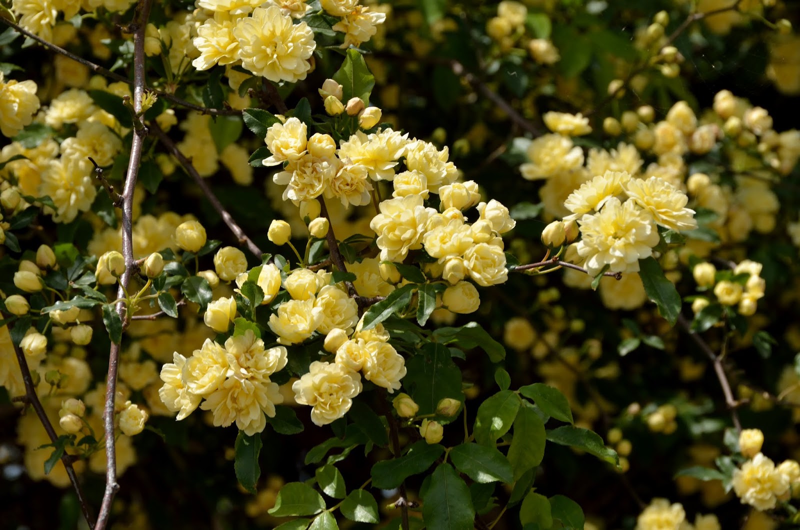 گونه ای رز بالارونده با بلندی و گستردگی ۱۰ متر که روی دیوار، فنس و پرگولا هدایت می شود. دارای برگ های کوچک سبز پررنگ است. گل های فراوان ، زرد رنگ و غیر معطر آن در اواخر بهار ظاهر می  شوند.